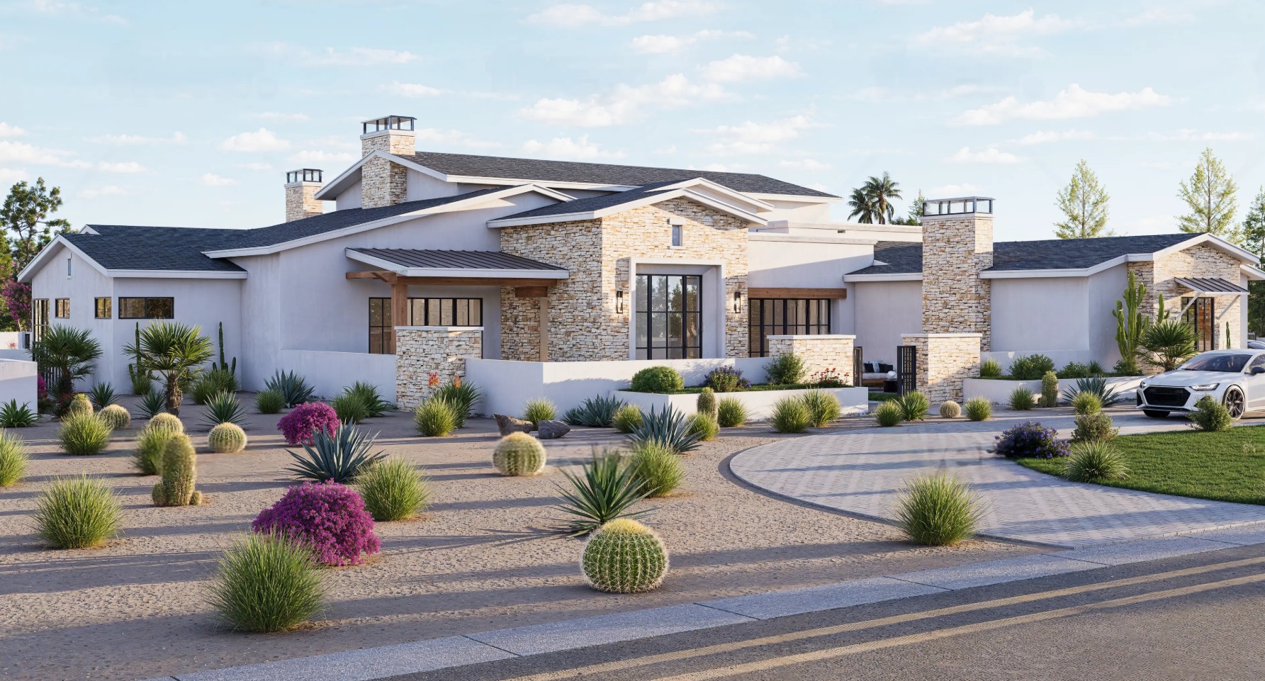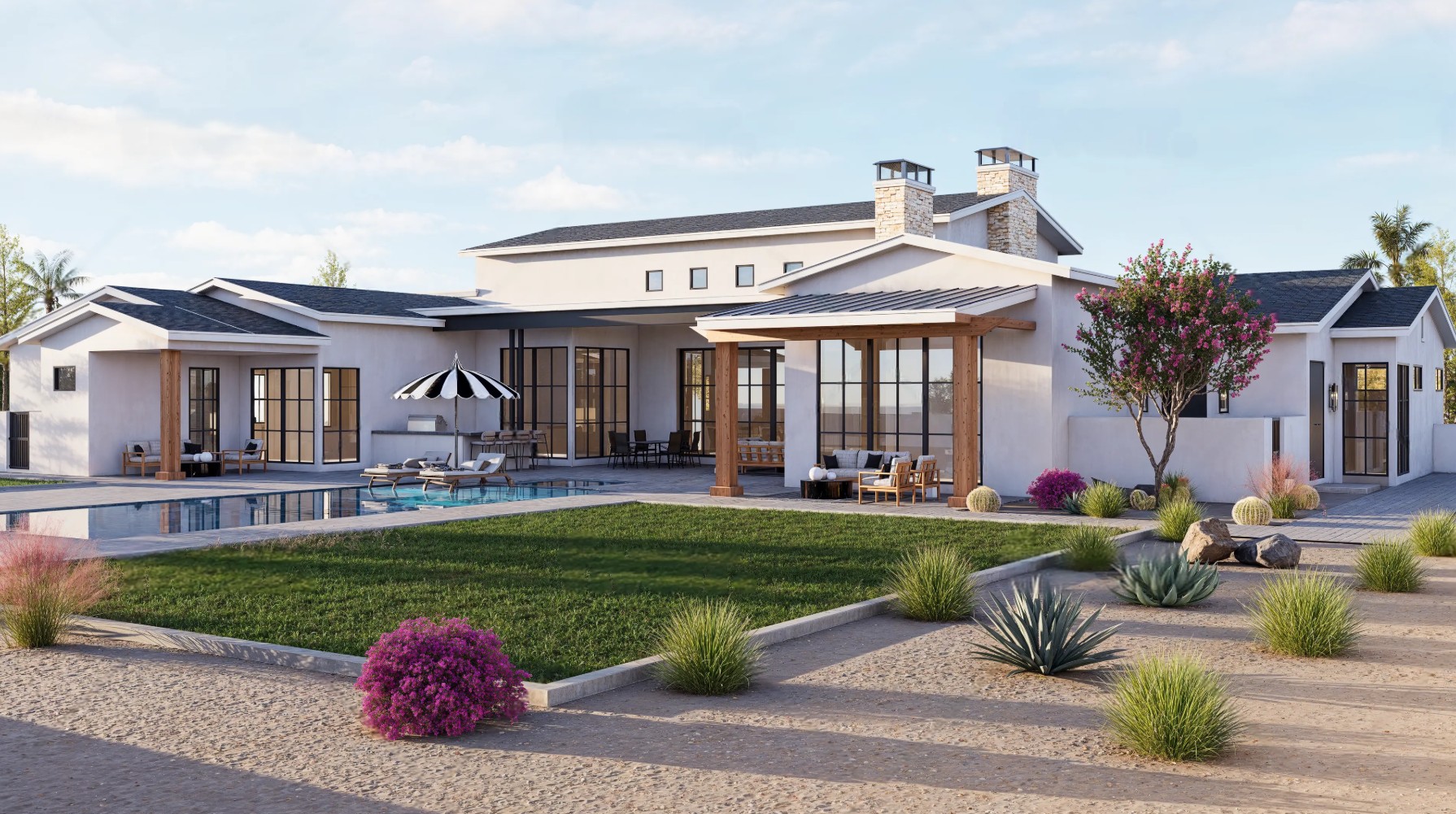 Located in one of Scottsdale’s up and coming neighborhoods, this modern ranch style home invokes an open floor plan with contemporary touches to give it a modern feel inside an out. Features include an inviting courtyard with fireplace and water feature, 4 bedrooms, 5 bathrooms, study, kitchen with hidden prep area that functions as a second kitchen. There is also a detached guest casita with direct access to the swimming pool.